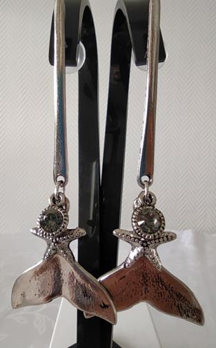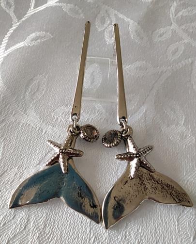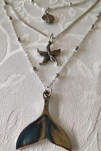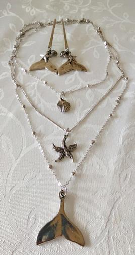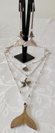 Cordão Triplo Prateado adornado com mini-esferas medindo 40cm, 52cm e 74cm respectivamente com 3 pingentes ( uma concha, uma estrela do mar e um rabo de Baleia). Brincos em metal prateado com haste com três pingentes ( um rabo de baleia, uma estrela do mar e uma pedra de brilho) medindo 8,5cm.