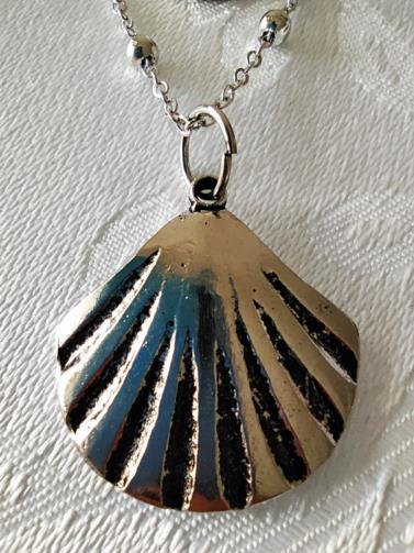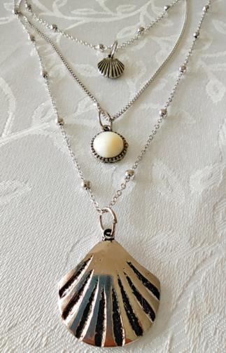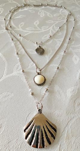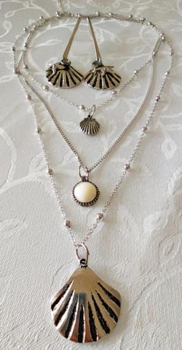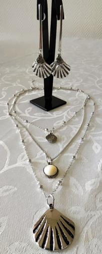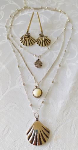 Cordão Triplo Prateado adornado com mini-esferas medindo 40cm, 52cm e 74cm respectivamente com 3 pingentes ( uma concha, uma pedra leitosa e uma concha maior). Brincos em metal prateado com haste com três pingentes ( uma concha, uma estrela do mar e uma pedra de brilho) medindo 8,5cm.