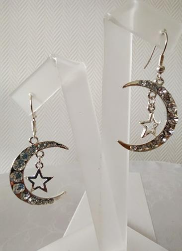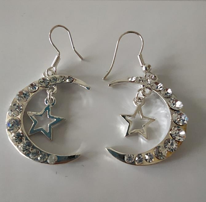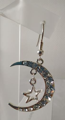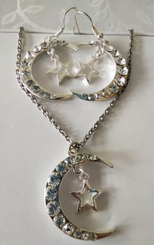 Colar em metal prateado medindo 42cm com um pingente em metal prateado em forma de Lua cravejadas de pedras de brilho medindo 3,0cm e dentro mais um pingente em forma de estrela.
