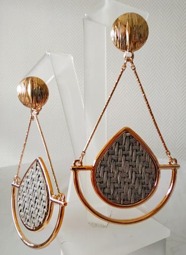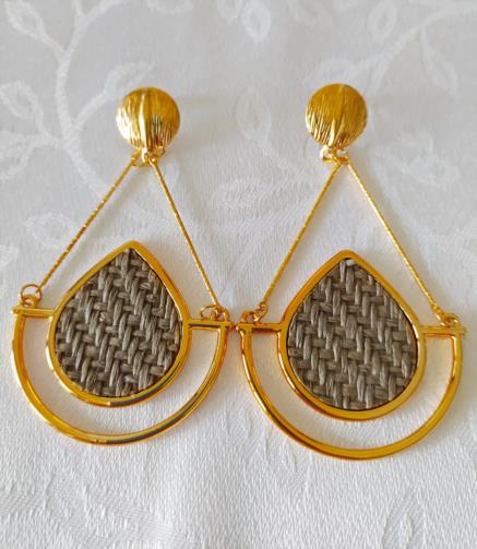 Peça em metal dourado formado com duas hastes e detalhes semi circular em forma de gota feito com palha na cor grafite medindo 9,0cm.