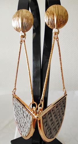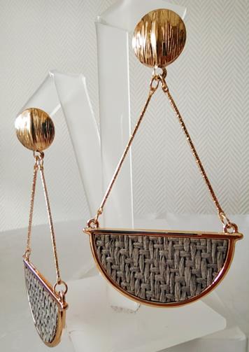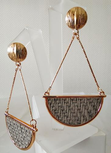 Peça em metal dourado formado com duas hastes e detalhes semi circular feito com palha na cor grafite medindo 9,0cm.