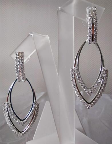 Peça em metal prateado tipo argola cravejadas de pedras de brilho com duas argolas ovais medindo 6cm.
