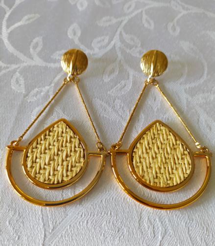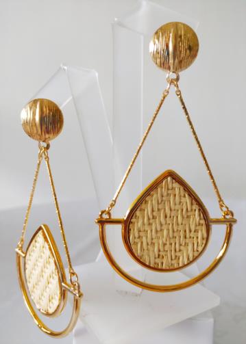 Peça em metal dourado formado com duas hastes e detalhes semi circular em forma de gota feito com palha na cor areia medindo 9,0cm.