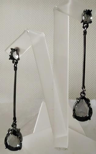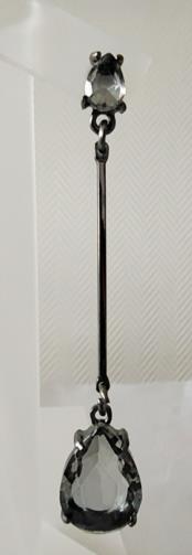 Peça em metal ônix com duas estruturas com pedras de brilho em forma de gota na cor grafite medindo 7,5cm.