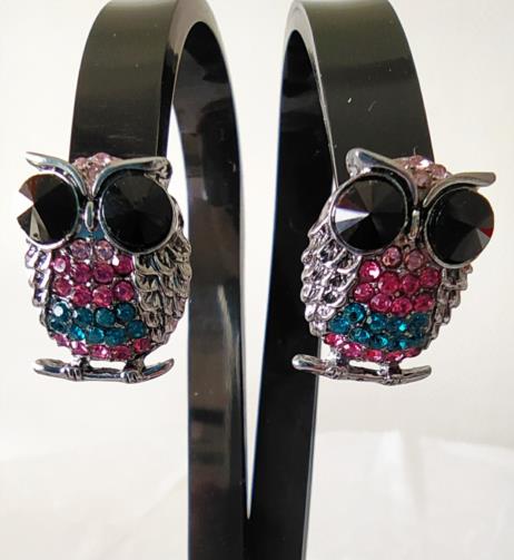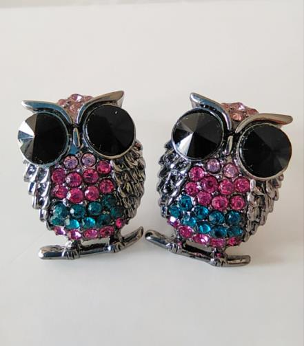 Peça em metal ônix em forma de coruja cravejadas de pedras de brilhos rosas e azuis medindo 1,7cm.