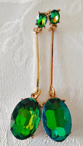 Peça em metal dourado com duas estruturas com pedras de brilho em forma oval na cor verde medindo 7,5cm.