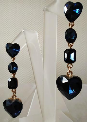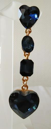 Peça em metal dourado com quatro pedras de brilho na cor azul marinho medindo 6,5cm . As pedras tem formas de coração , oval e retangular.