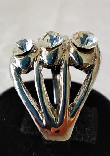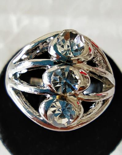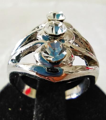 Anel em metal prateado indexado com três pedras de brilho centrais. Nº18