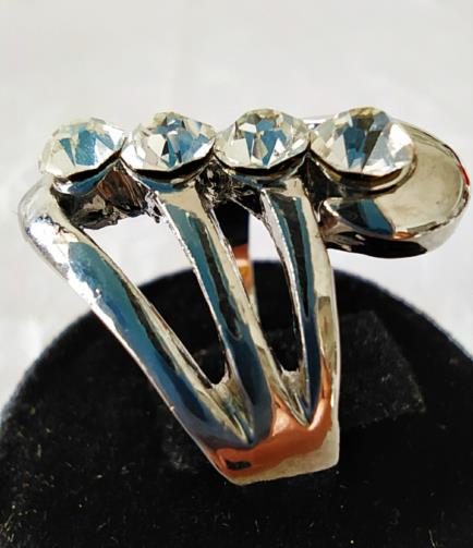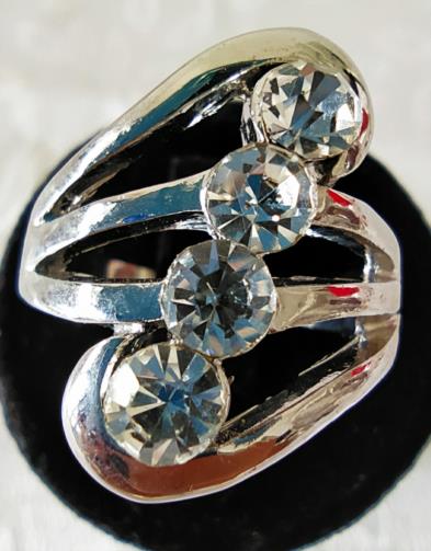 Anel em metal prateado indexado em estilo com quatro pedras de brilho centrais. Nº18