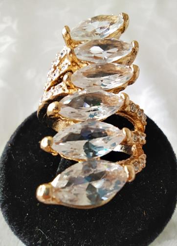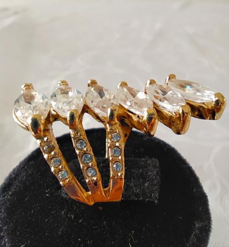 Anel Triplo indexado em metal dourado cravejado de pedras de brilho com seis pedras transparentes em forma de gota sobrepostas. Nº18