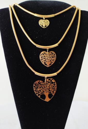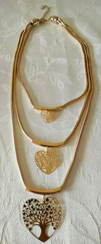 Cordão triplo em metal dourado medindo aproximadamente 40cm, 50cm, 60cm respectivamente com três pingentes em metal dourado com o símbolo da arvore da vida em metal dourado.