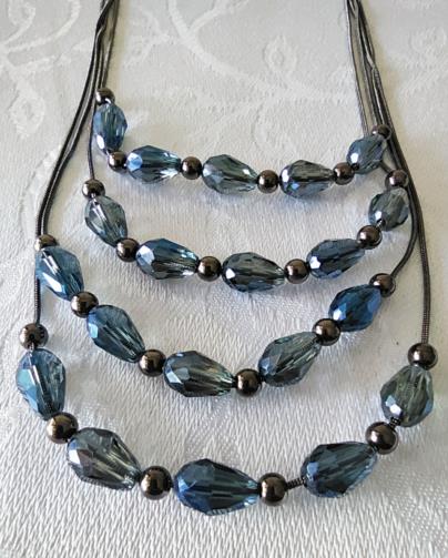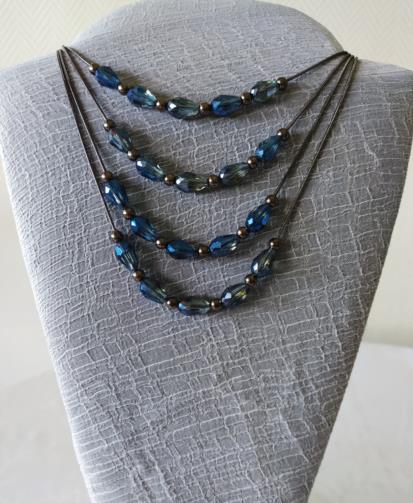 Cordão quádruplo em metal na cor ônix medindo 40, 44, 48 e 52cm respectivamente com enfeites de efeito na cor azul em cada cordão.