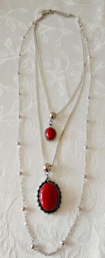 Cordão triplo em metal prateado medindo 40, 52 e 72cm respectivamente sendo dois com pingentes em estruturas com pedras vermelhas e um com pequenas esferas prateadas de forma intermitente.