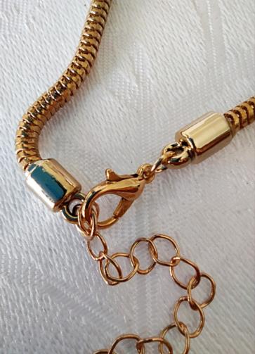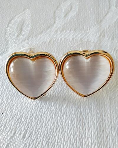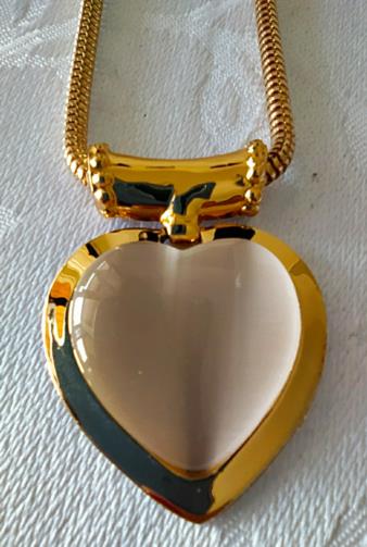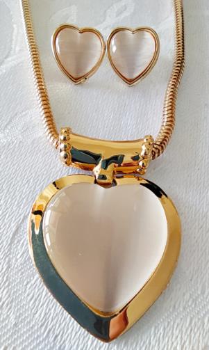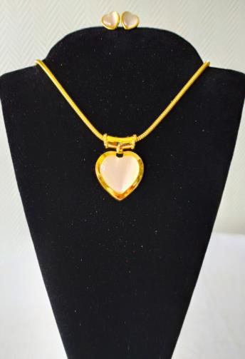 Cordão em metal dourado medindo 44cm com um pingente em estrutura de um coração em metal dourado e uma pedra branca leitosa no centro medindo 4,0cm. Brinco em metal dourado em forma de coração com uma pedra branca leitosa no centro medindo 1,5cm.