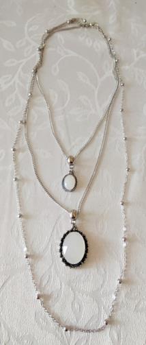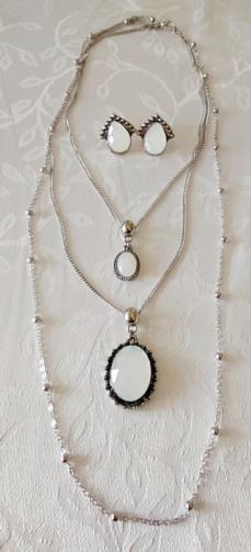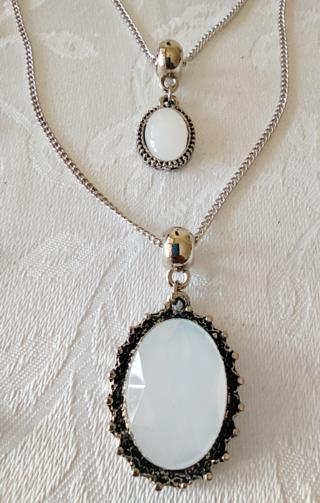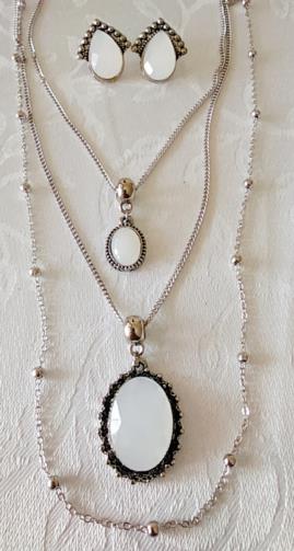 Cordão triplo em metal prateado medindo 40, 52 e 72cm respectivamente sendo dois com pingentes em estruturas com pedras branca leitosa e um com pequenas esferas prateadas de forma intermitente. Brinco em metal prateado com uma pedra branca leitosa no centro medindo 2,5cm.