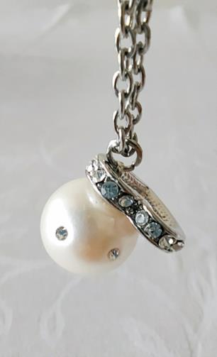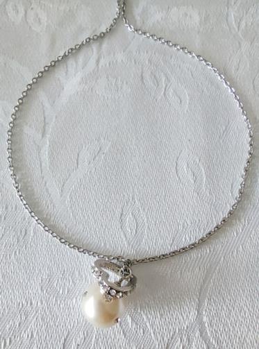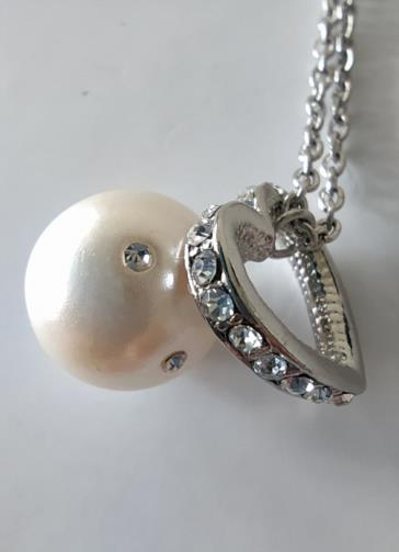 Cordão em metal prateado medindo 42cm ajustável (+6cm) com uma estrutura de metal prateado cravejado de pedras de brilho em forma de coração prateado medindo 1,5cm com um pingente de pérola sintética cravejada de pedras de brilho.