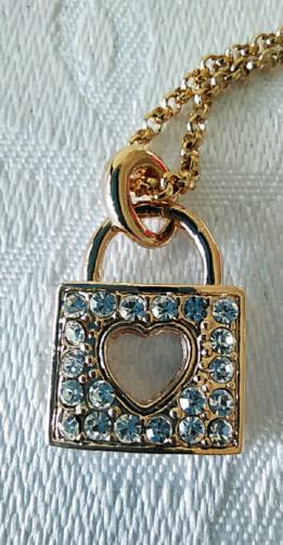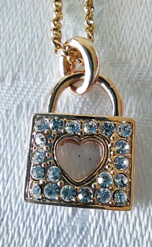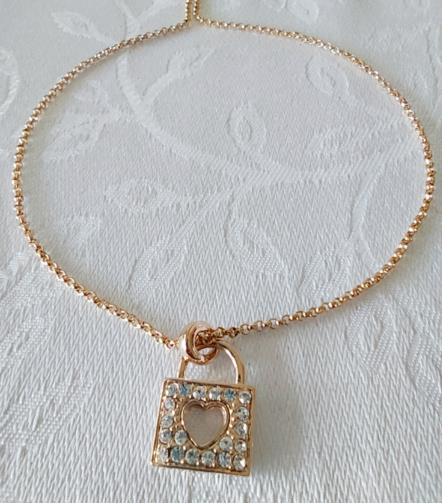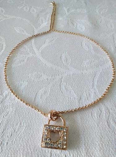 Cordão em metal dourado medindo 42cm ajustável (+6cm) com uma estrutura de metal dourado cravejado de pedras de brilho em forma de cadeado com uma fechadura em forma de coração medindo 2,5cm.
