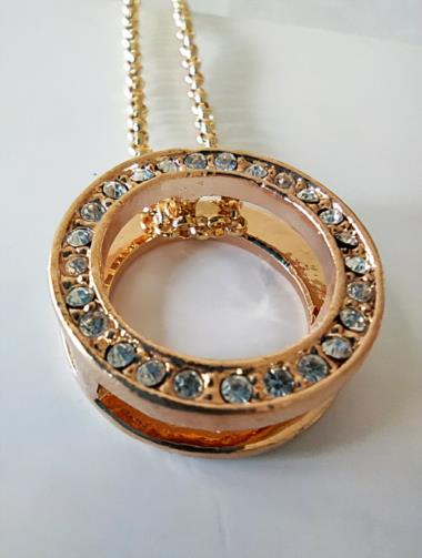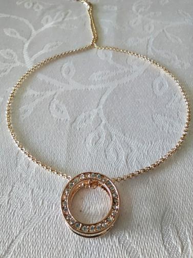 Cordão em metal dourado medindo 42cm ajustável (+6cm) com uma estrutura de metal dourado cravejado de pedras de brilho em forma de circulo duplo indexado medindo 2,0cm.