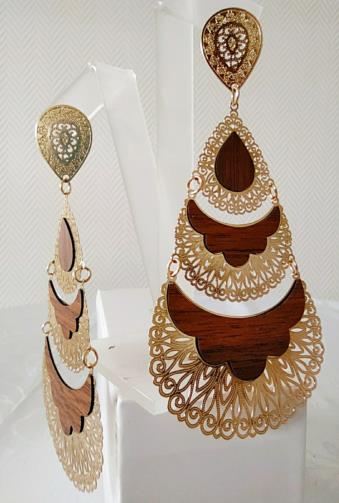 Peça em metal dourado com madeira articulado em formato de leque triplo medindo 10,5 cm.
