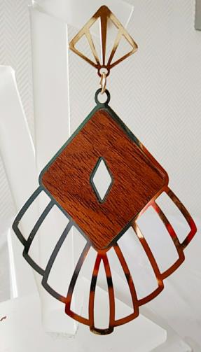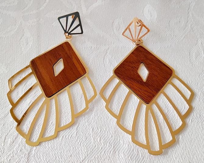 Peça em metal dourado com madeira em formato geométrico estilizado medindo 9,0 cm.