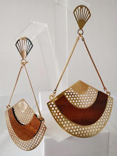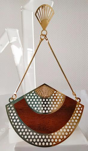 Peça em metal dourado com madeira articulado em formato de leque medindo 9,0 cm.