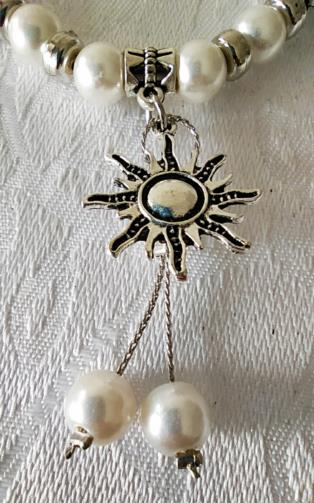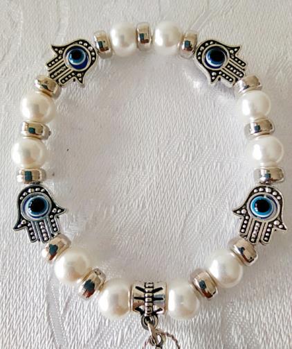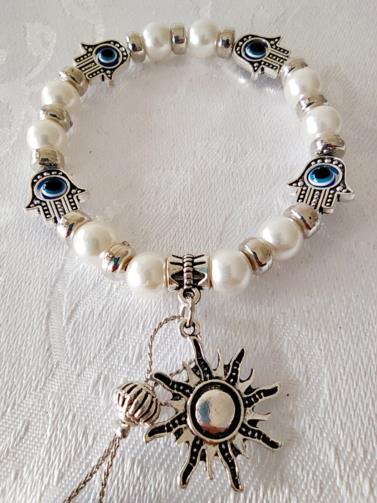 Pulseira feita de pérolas sintéticas e metais prateados, adornadas com quatro Mão de Hansá em metal prateado com o olho grego no interior de cada mão , anéis em metal prateado e dois pingentes , um de Sol estilizado em metal prateado e um feito com duas pérolas sintéticas na ponta medindo 21cm de circunferência.