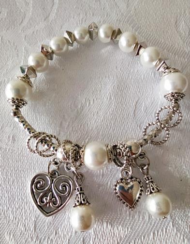 Pulseira feita de cristais de acrílico brancas e prateadas, anéis em metal prateado adornadas com quatro pingentes de corações prateadas em gramatura e pérolas sintéticas medindo 21cm de circunferência.