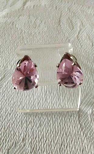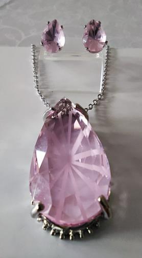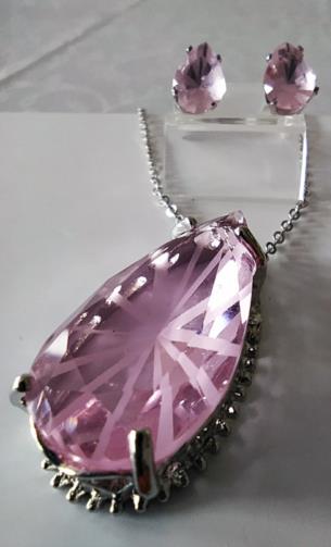 Cordão em metal prateado medindo 44cm ajustável (+5cm) com uma estrutura em metal prateado em forma de gota com uma pedra rosa de efeito em forma de gota medindo 3,0 cm. Um par de brincos com uma estrutura em metal prateado em forma de gota com uma pedra rosa de efeito em forma de gota medindo 1,0 cm.