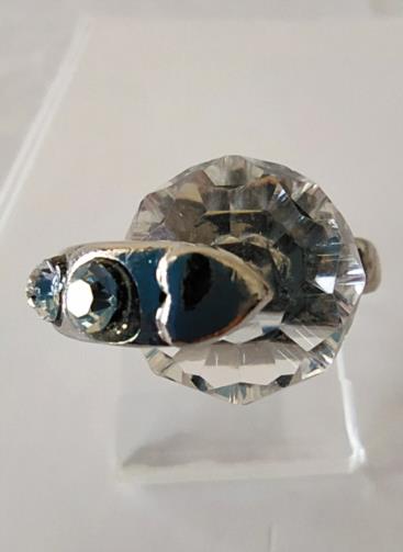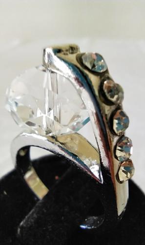 Anel em estilo em metal prateado cravejado de pedras de brilho adornada com uma pedra Transparente de efeito no centro. Nº18