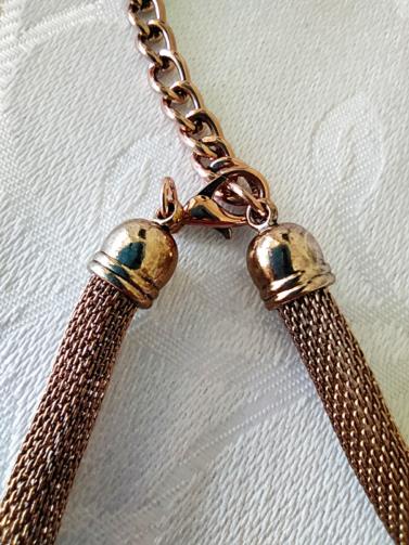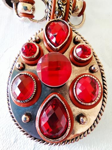 Cordão em metal maleável dourado medindo 44cm ajustável (+5cm) com acabamentos em cilindros dourados cravejados de pedras de brilho douradas e anéis com um pingente de estrutura dourada em forma de gota com sete pedras de efeito vermelhas medindo 7,0cm.