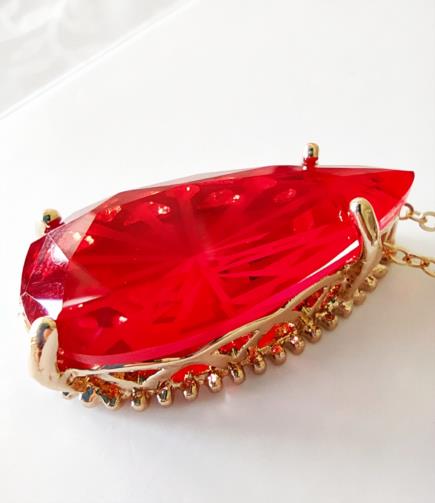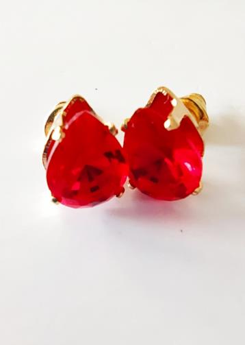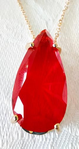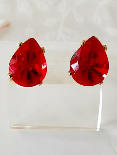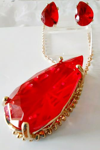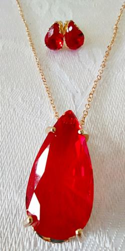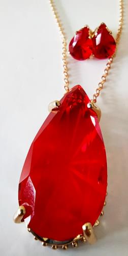 Cordão em metal dourado medindo 44cm com uma estrutura em metal dourado em forma de gota com uma pedra vermelha de efeito em forma de gota medindo 3,0 cm. Um par de brincos com uma estrutura em metal dourado em forma de gota com uma pedra vermelha de efeito em forma de gota medindo 1,0 cm.