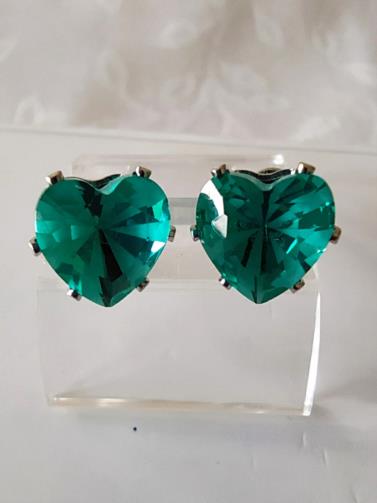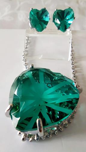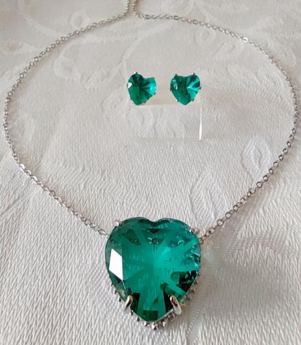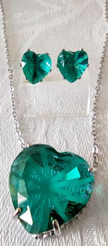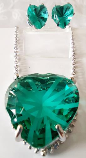 Cordão em metal prateado medindo 44cm com uma estrutura em metal prateado em forma de coração com uma pedra verde de efeito em forma de coração medindo 3,0 cm. Um par de brincos com uma estrutura em metal prateado em forma de coração com uma pedra verde de efeito em forma de coração medindo 1,0 cm.