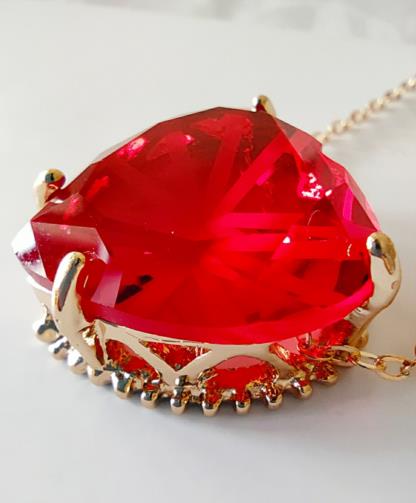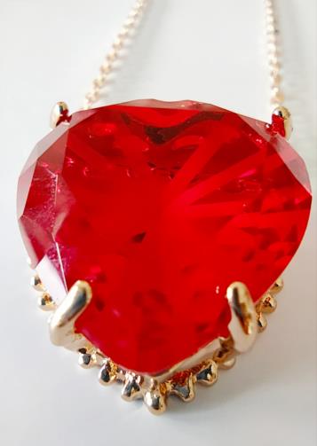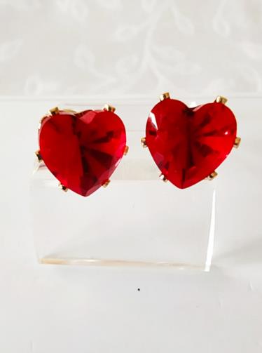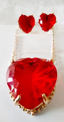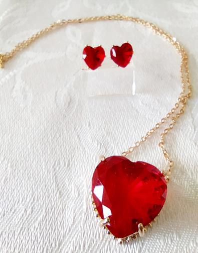 Cordão em metal dourado medindo 44cm com uma estrutura em metal dourado em forma de coração com uma pedra vermelha de efeito em forma de coração medindo 3,0 cm. Um par de brincos com uma estrutura em metal dourado em forma de coração com uma pedra vermelha de efeito em forma de coração medindo 1,0 cm.