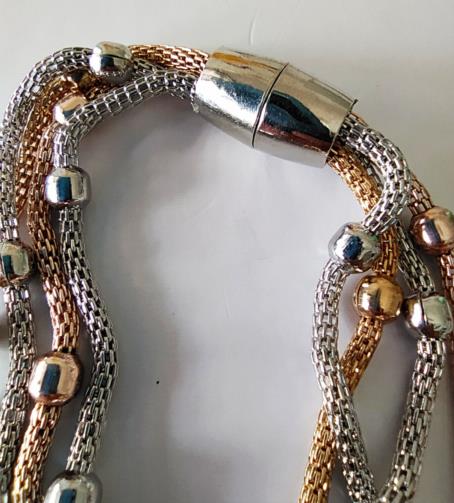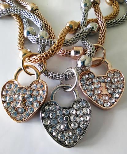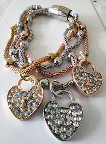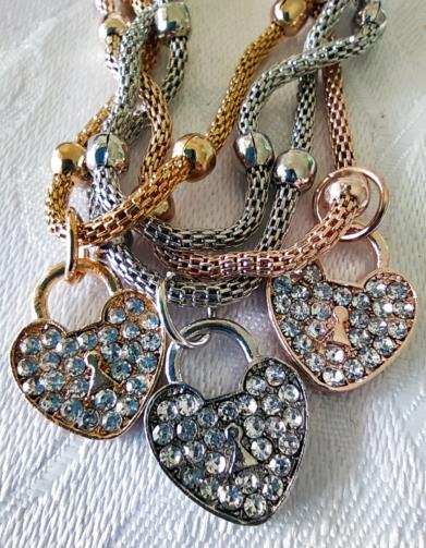 Quatro Pulseiras indexadas em uma estrutura metalizada com pequenas esferas intermitentes sendo de cada pulseira são feita de metais de cores diferentes; uma dourada com um Coração Dourado cravejada de pedras de brilho, uma prateada com um Coração prateado cravejada de pedras de brilho e uma rose com um Coração rose cravejado de pedras de brilho e uma somente com esferas douradas medindo 21 cm.