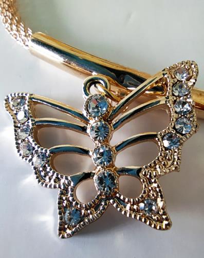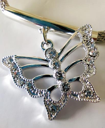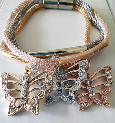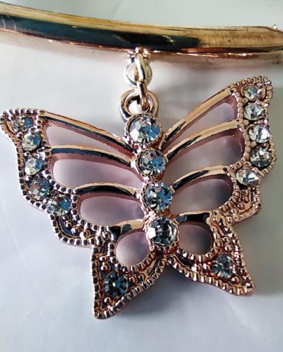 Três Pulseiras indexadas em uma estrutura sendo de cada pulseira são feita de metais de cores diferentes; uma dourada com uma Borboleta cravejada de pedras de brilho, uma prateada com uma Borboleta prateada cravejada de pedras de brilho e uma rose com uma Borboleta rose cravejada de pedras de brilho medindo 21 cm.