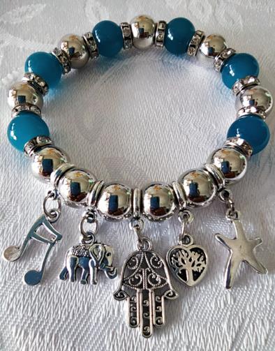 Pulseira feita de cristais de acrílico azul turquesa e prateados , adornadas com acabamentos em anéis prateados cravejados de pedras de brilho e cinco pingentes em metal prateado de Estrela do Mar,um Coração com a Arvore da Vida, uma Mão de Hansá,um Elefante e uma Nota Musical medindo 21cm de circunferência.