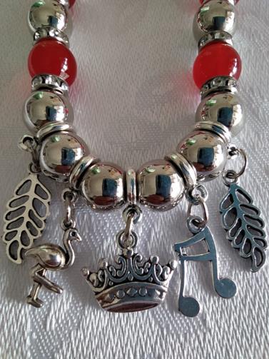 Pulseira feita de cristais de acrílico vermelhos e prateados , adornadas com acabamentos em anéis prateados cravejados de pedras de brilho e cinco pingentes em metal prateado de duas Folhas, um Flamingo, uma Coroa e uma nota medindo 21cm de circunferência.
