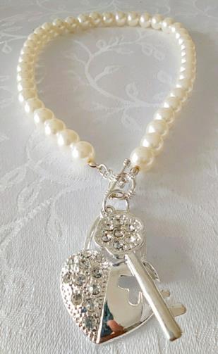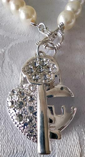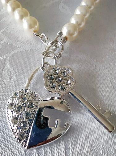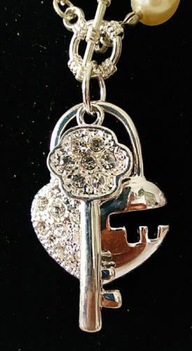 Colar em pérolas sintéticas medindo 48cm com dois pingentes em metal prateado de um Coração cravejado de pedras de brilho e uma Chave cravejada de pedras de brilho medindo 4,5cm cada.