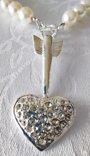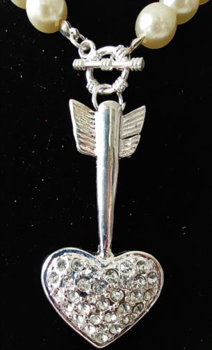 Colar em pérolas sintéticas medindo 48cm com um pingente em metal prateado de um Coração na ponta da flecha medindo 6,5cm cada.