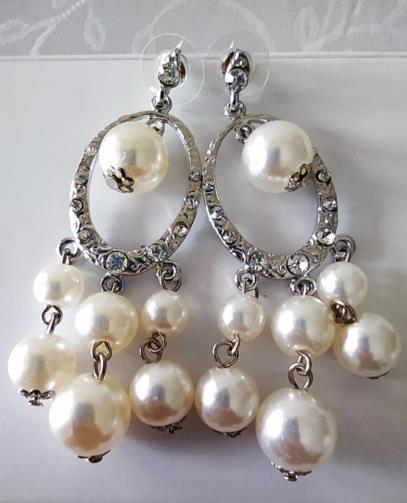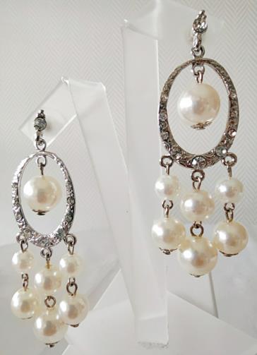 Peça em metal prateado em forma Oval cravejado de pedras de brilho com 4 pingentes em pérolas sintéticas.