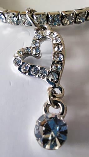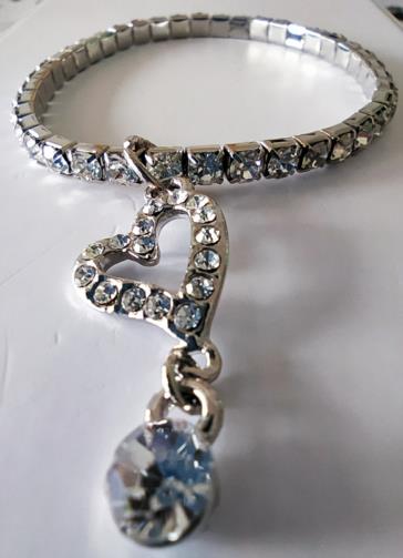 Pulseira em metal prateado maleável ( 18cm à 20cm) cravejado de pedras de brilho com um pingente em forma de coração com um pingente em ponto de luz medindo 3cm.