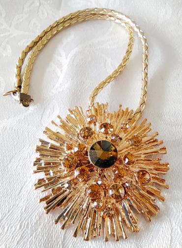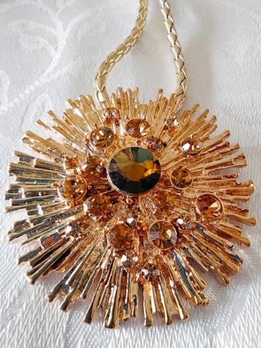 Cordão em couro sintético na cor dourada medindo 44cm com um pingente em metal dourado retorcido trabalhado em gramatura em forma de sol estilizado cravejado de pedras de brilho douradas e uma pedra verde no centro medindo 6,0cm.